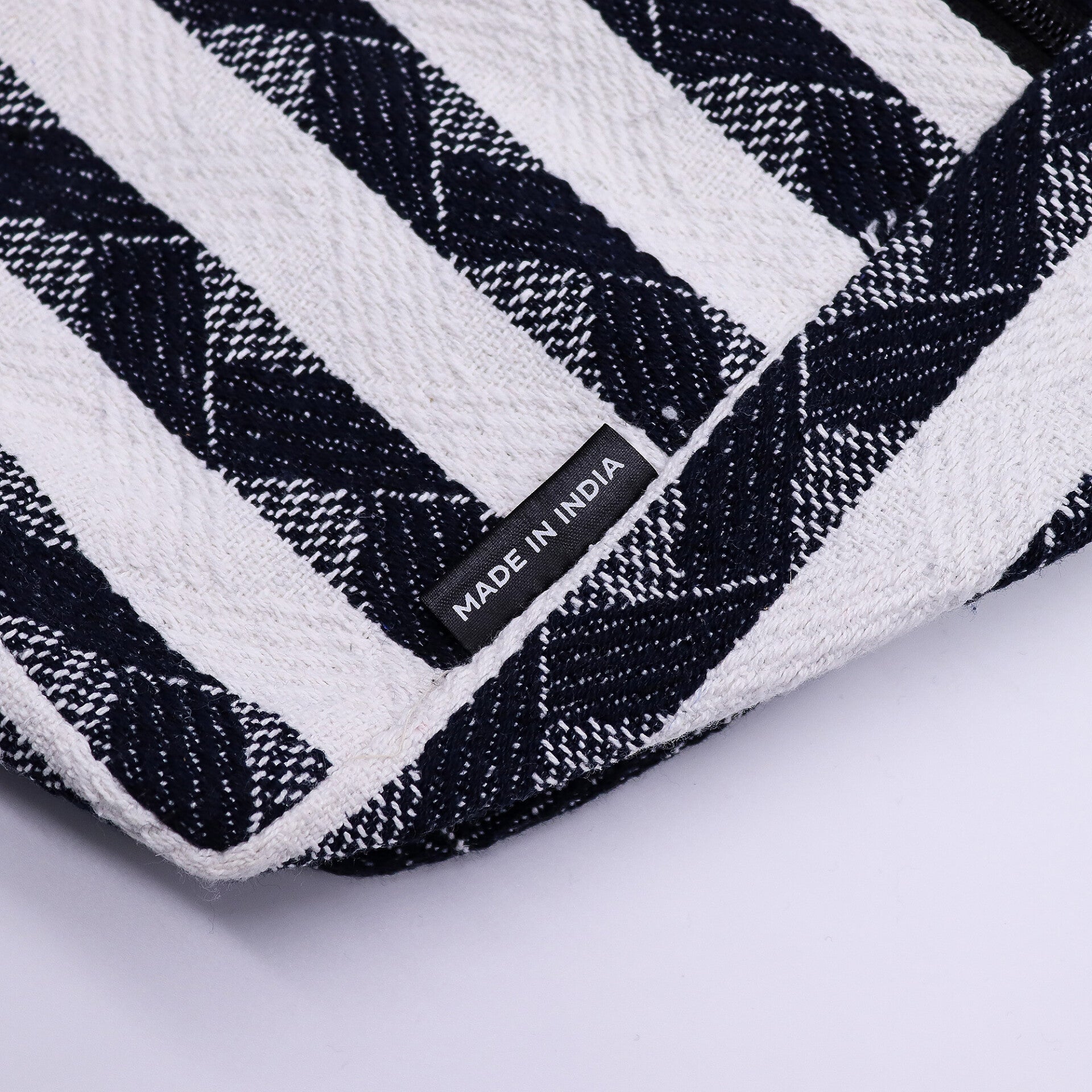 Each bag showcases traditional jacquard weaving techniques from India, giving it a textured finish and a timeless, handcrafted feel.